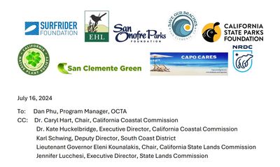 The Surfrider Foundation and 8 other environmental organization including NRDC and the California State Parks Foundation are requesting that Orange County Transportation Authority (OCTA) conduct a full environmental impact report (EIR) on its proposed additional shore armoring in San Clemente. The letter reads " All viable alternatives to shoreline armoring must be carefully examined, including nature-based alternatives, rail relocation or retirement and train speed management."